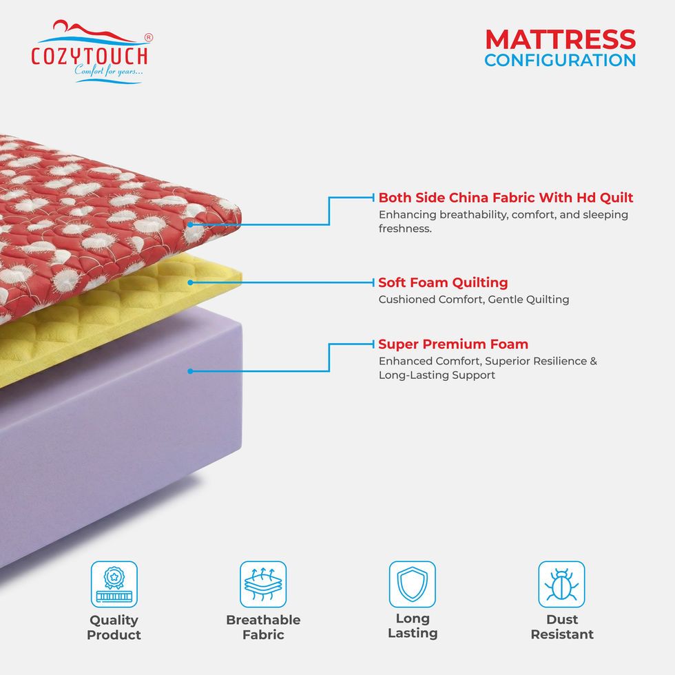 Kya aap ek simple, reliable aur budget-friendly mattress dhundh rahe hain? COZYTOUCH Comfy bilkul aapke liye hai. Yeh entry-level mattress COZYTOUCH ki core quality ke saath aata hai — solid foam support, breathable fabric, aur 5 saal ki warranty.
